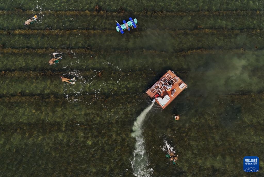 5月12日,河北省昌黎县茹荷镇一家海参养殖合作社的工人在捕捞海参(无人机照片)。新华社记者 杨世尧 摄
